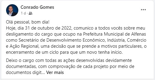 A saída do governo foi anunciada por Conrado, na última segunda-feira, em uma carta aberta (clique aqui e leia) ao prefeito Fábio Marques Florêncio (Fábio da Oncologia/PT). O ex-secretário alegou que a decisão foi motivada por questões particulares. “Uma decisão que se prende a motivos particulares, o encerramento de um ciclo para que um novo tenha início”, escreveu nas redes sociais.