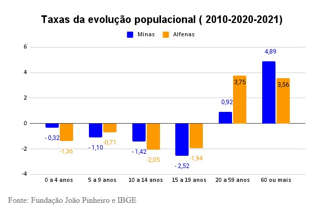 É primordial apontar que as informações apresentadas tomaram por base dados do Censo do IBGE de 2010, projeções do IBGE para Minas de 2021 e projeções da Fundação João Pinheiro 2020 para Alfenas.