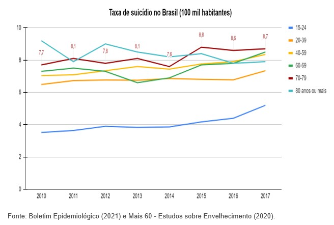 No mês de setembro, do ano de 2021, o Ministério da Saúde divulgou um Boletim Epidemiológico, em que se obteve acesso aos registros das tentativas e das mortes ocasionadas pelo suicídio no Brasil. Assinalou-se um alerta para o alto índice de pessoas que se suicidaram com mais de 70 anos. Nesse grupo populacional indicado foi possível constatar a média de 8,9 mortes por 100 mil habitantes nos últimos seis anos.