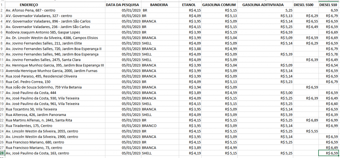 De acordo com o levantamento, o preço da gasolina varia de R$ 4,59 a R$ 5,15, enquanto que o do etanol sofre variação de R$ 3,88 a R$ 4,15. Os preços são dos dias 5 e 6 de janeiro.