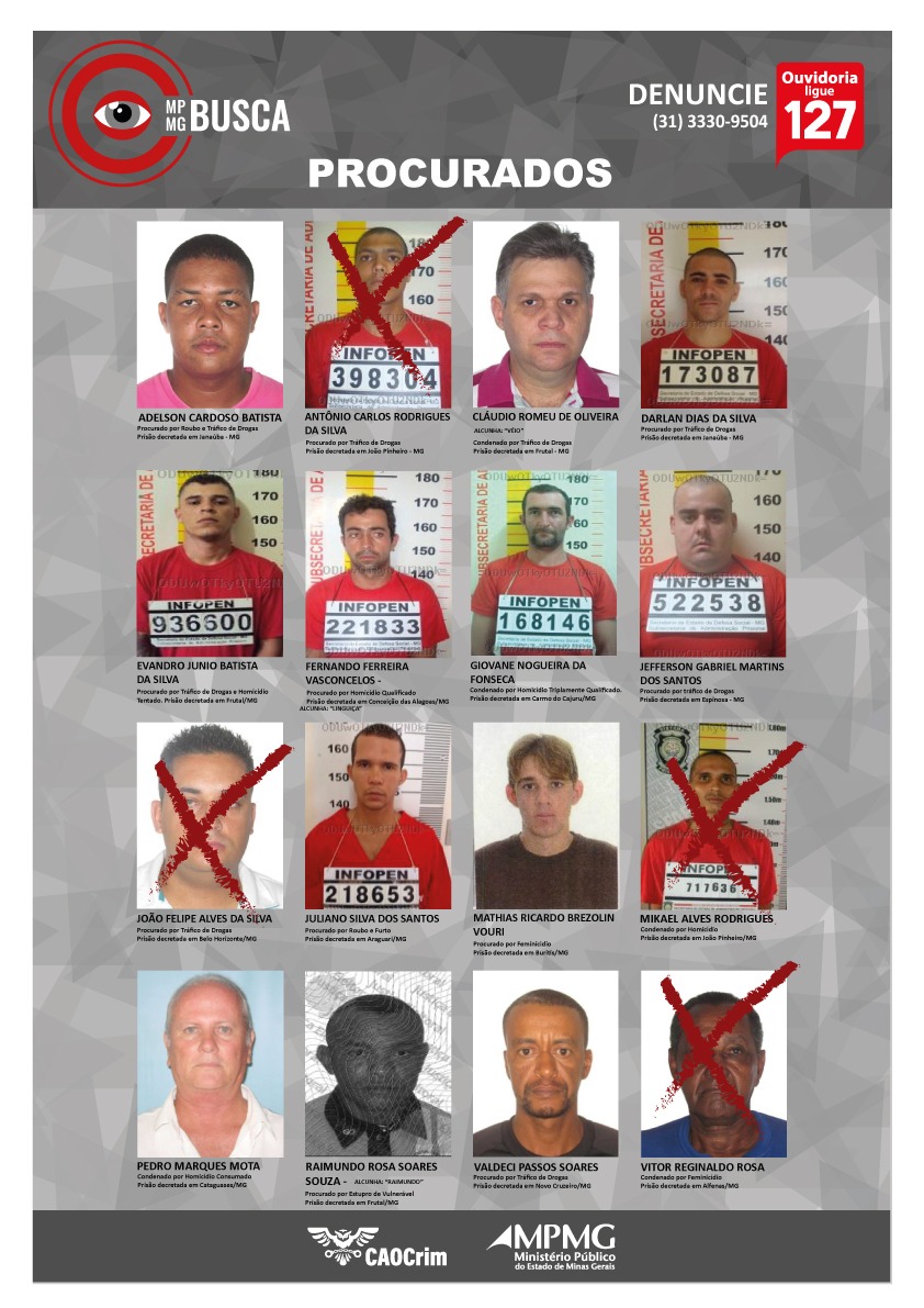 Em razão de pedidos realizados por Promotorias de Justiça de Alfenas, Araguari, Belo Horizonte, Buritis, Espinosa, Carmo do Cajuru, Cataguases, Conceição das Alagoas, Frutal, Janaúba, João Pinheiro e Novo Cruzeiro, atualmente são procurados em todo o país, por instituições públicas parceiras do Ministério Público, 16 autores de crimes de estupro, tráfico de drogas, homicídio, feminicídio, furto e roubo.