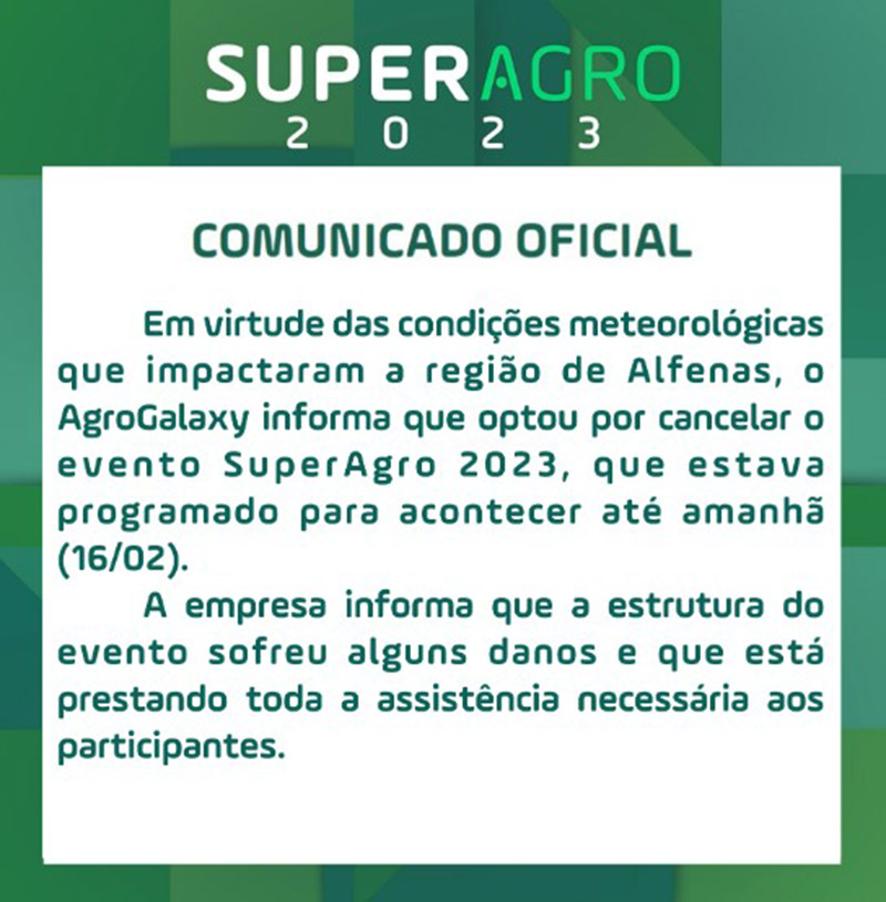 A organização da SuperAgro, feira de agronegócios promovida pela Agrogalaxy, decidiu cancelar o último do evento, que seria nesta quinta-feira. O comunicado oficial, no site do evento, foi publicado após a estrutura do evento ser atingida pela forte chuva na tarde de quarta-feira. Cinco pessoas ficaram feridas.