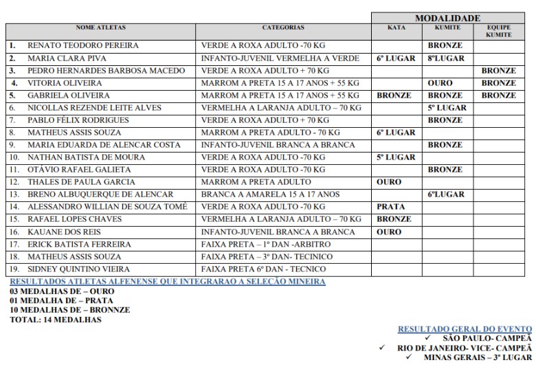 No sábado (20/05), aconteceu a competição Kata (forma) e no domingo (21/05) a competição de Kumite (luta). A equipe retornou para Alfenas com 14 medalhas dos atletas que integrarão a Seleção Mineira. Confira: