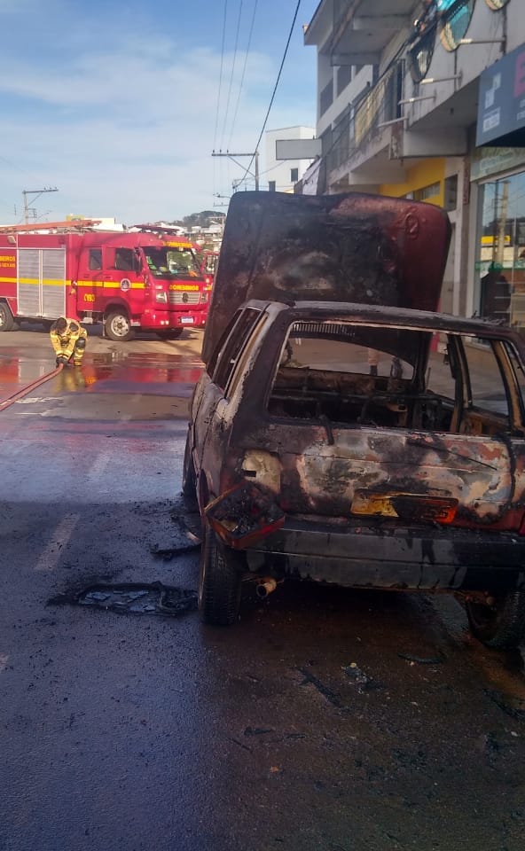 Um carro pegou fogo e ficou praticamente destruído. O caso foi na tarde de sábado em Machado, na rua Artur Bernardes em um local próximo a rodoviária da cidade.