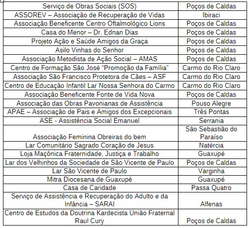 Entre as entidades beneficiadas está o Serviço de Assistência e Recuperação do Adulto e da Infância (Sarai), em Alfenas. No Sul de Minas, foram beneficiadas 23 entidades sem fins sem fins lucrativos, de 13 cidades. O valor da destinação está estimando em R$1 milhão. A cerimônia de entrega das mercadorias foi em Poços de Caldas no último dia 7.