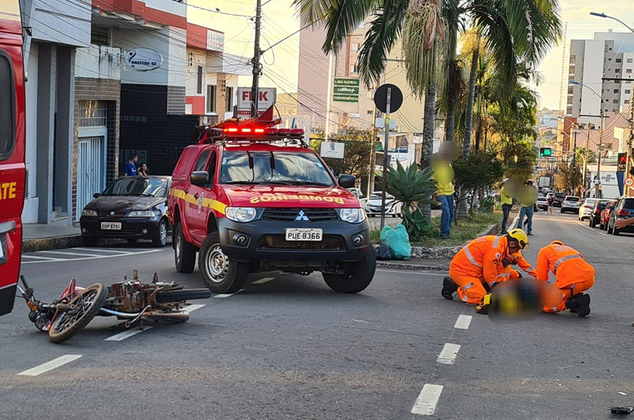 Com o impacto da colisão, a motociclista, 23 anos, caiu e se feriu. Os bombeiros realizaram o atendimento da vítima que teve escoriações na perna, lesão no joelho e tornozelo direito.