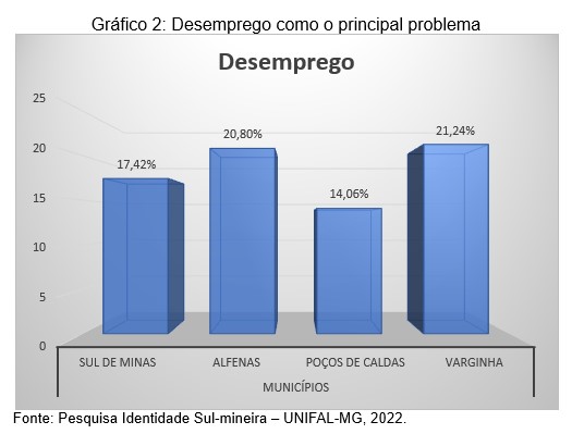 O desemprego foi o principal problema apontado pelos sul-mineiros com mais de 17%, conforme aponta o gráfico 2. Em Alfenas esse percentual também foi alto: quase 21%; em Poços de Caldas de 14% e, em Varginha, era o principal problema para mais de 21% dos entrevistados.