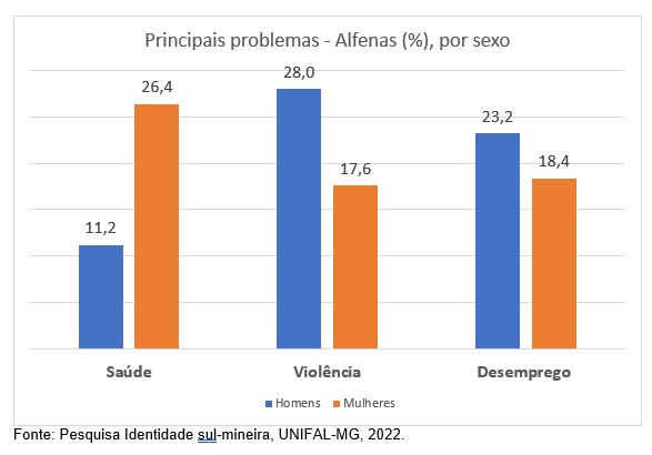 Se a violência foi o principal problema para os homens, a saúde era o que mais preocupava as mulheres. Foi bastante destacada a diferença das percepções apresentadas por homens e mulheres acerca do principal problema do município. Essa conclusão foi feita pelo pelo projeto de extensão “A Imaginação Sociológica e o Sul de Minas”, do curso de Ciências Sociais da Unifal (Universidade Federal de Alfenas).