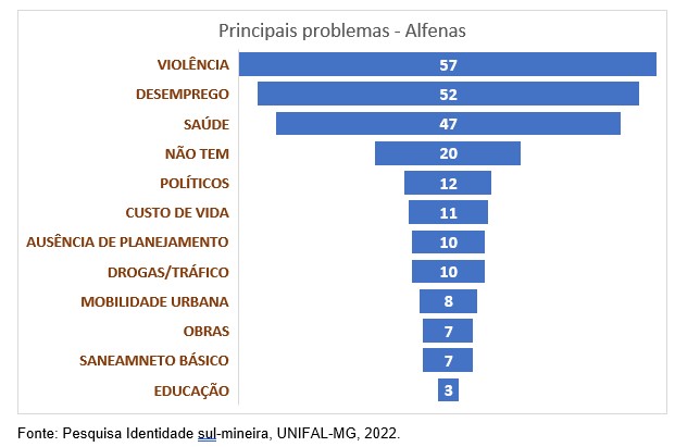 Os dados analisados são da Pesquisa Identidade Sul-mineira, realizada pela Unifal, que entrevistou 1320 moradores em 20 municípios do Sul de entre maio e junho do ano passado. Alfenas e Poços apresentaram a violência como principais problemas, mas para o Sul de Minas e Varginha o desemprego é mais sentido.