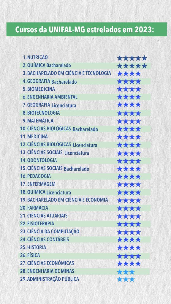 A Unifal (Universidade Federal de Alfenas) teve 29 cursos de graduação classificados entre os melhores do Brasil no Guia da Faculdade Estadão 2023. Os cursos de Nutrição e Química (Bacharelado) receberam 5 estrelas, nível máximo do ranking, considerado excelente. Outros 25 cursos ficaram com 4 estrelas, a segunda melhor colocação, e dois receberam 3 estrelas.