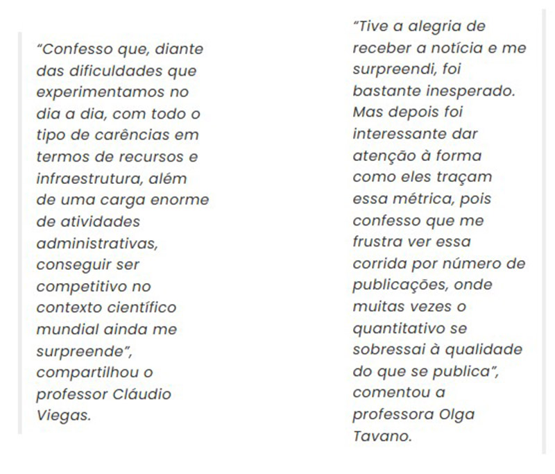 Cláudio Viegas Júnior aparece na lista referente aos pesquisadores mais influentes, quando se avalia o impacto das pesquisas durante toda a carreira acadêmica. Nos anos de 2021 e 2022, o professor já havia aparecido na mesma lista e também entre os mais citados no último ano, que na atualização com dados de 2022, nessa edição 2023 aparece também a professora Olga Luisa Tavano. A docente é a primeira pesquisadora mulher da Unifal a entrar no ranking, figurando entre as poucas pesquisadoras brasileiras que aparecem na lista.