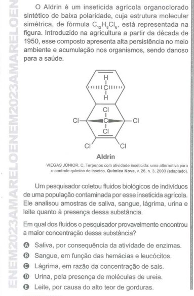 A questão aborda uma pesquisa com um inseticida agrícola e remete a coleta de fluidos biológicos de pessoas contaminadas. Na sequência, questiona em qual dos fluidos o pesquisador provavelmente foi encontrada a maior concentração da substância.