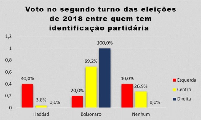Quem se identificava com a direita vota em candidatos da direita, mas essa lógica não se aplicou aos esquerdistas. Como se observa, há uma certa desorientação por parte desses, com 40% votando no Haddad, associado ao Partido dos Trabalhadores (PT), outros 40% em nenhum e 20% em Bolsonaro. Ou seja, parte daqueles que afirmam se identificar com a esquerda votaram em Bolsonaro no segundo turno das eleições de 2018. Também se observa que os que se identificavam com partidos de centro votaram mais em Bolsonaro e menos de 4% em Haddad.