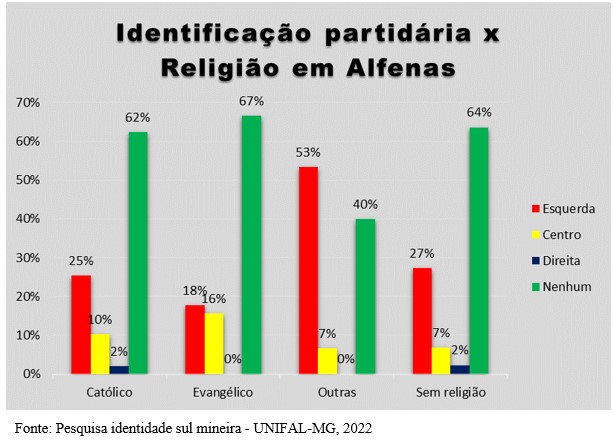 No que se refere à relação entre religião e identificação partidária, nota-se em Alfenas o mesmo fenômeno do Sul de Minas: a maioria das pessoas não se identifica com nenhum partido, sendo o grupo “Outras” (que incluem cristãos que não são católicos ou evangélicos) o único em que a maioria das pessoas cita algum partido, e mais da metade deles são adeptos da esquerda. Em todos os grupos religiosos, a maioria dos que citaram algum partido são da esquerda.
