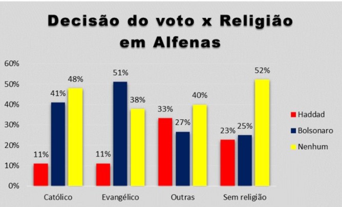 Ao se analisar o comportamento de cada grupo religioso de Alfenas, pode-se observar que os evangélicos realmente foram os que mais votaram em Bolsonaro, mais de 50%. Entre os outros grupos, os maiores percentuais foram de pessoas que afirmaram não ter votado em nenhum dos dois candidatos. Todavia, ao se analisar os que citaram algum candidato, percebe-se que católicos também votaram em massa em Bolsonaro, e que apenas 11% — mesma porcentagem dos evangélicos — votaram em Haddad. Esse resultado mostra que a vitória de Bolsonaro não se deve apenas a evangélicos, pois católicos também constituíram uma força na vitória da direita em 2018.