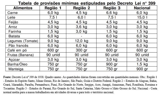 Os produtos da cesta básica e suas respectivas quantidades mensais são diferentes por região e foram definidos pelo Decreto Lei nº 399 de 1938, que continua em vigor. A sua estrutura encontra-se na tabela a seguir: