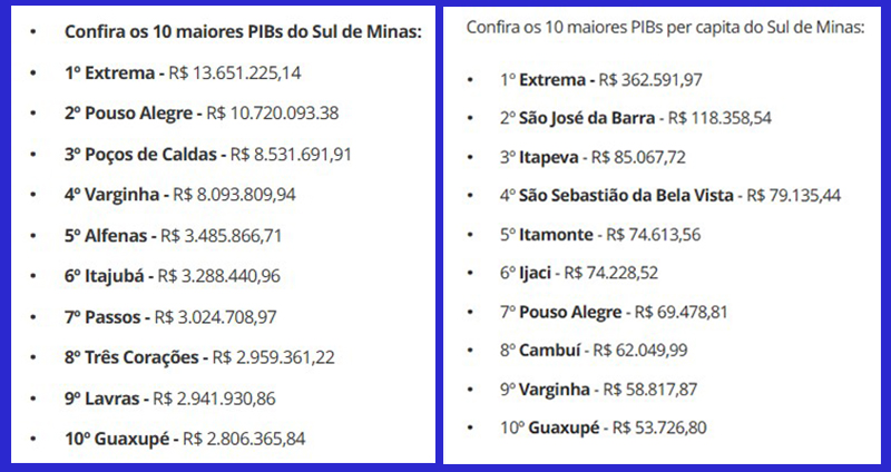 No levantamento anterior, que tem como base 2019, Alfenas ocupava a sétima posição na região. No novo ranking do Sul de Minas, Alfenas está atrás de Extrema (que segue na liderança), Pouso Alegre, Poços de Caldas e Varginha.