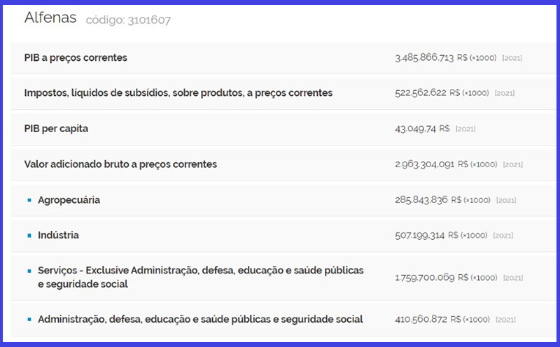 A compilação dos resultados do PIB municipal é coordenada pelo IBGE em parceria com os institutos estaduais de estatísticas, no caso de Minas Gerais, a Fundação João Pinheiro.