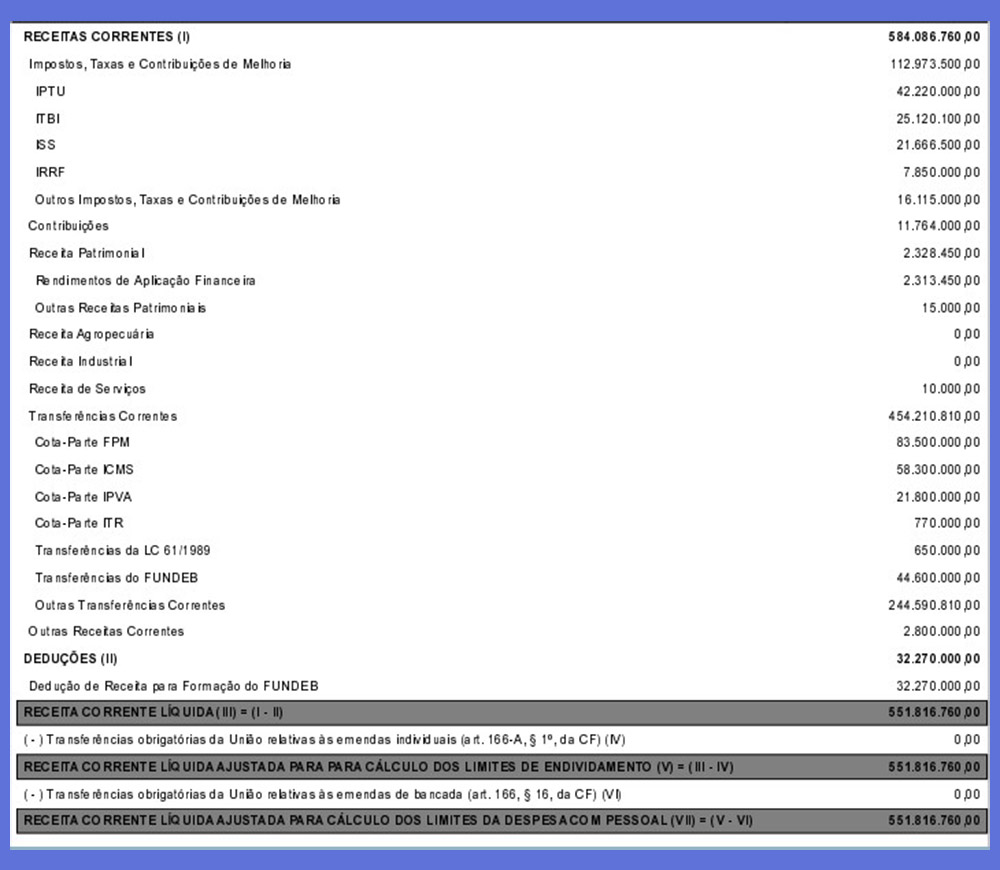 O orçamento de 2024 tem nas transferências correntes a maior parte da receita. São R$ 454 milhões repassados pela União e pelo Estado devido a transferências obrigatórias de impostos, como o Fundo de Participação dos Municípios/FPM (R$ 83 milhões), Imposto sobre Circulação de Mercadorias e Serviços/ICMS (R$ 58,3 milhões), Imposto sobre Propriedade de Veículo Automotor/IPVA (R$ 21,8 milhões), entre outros.
