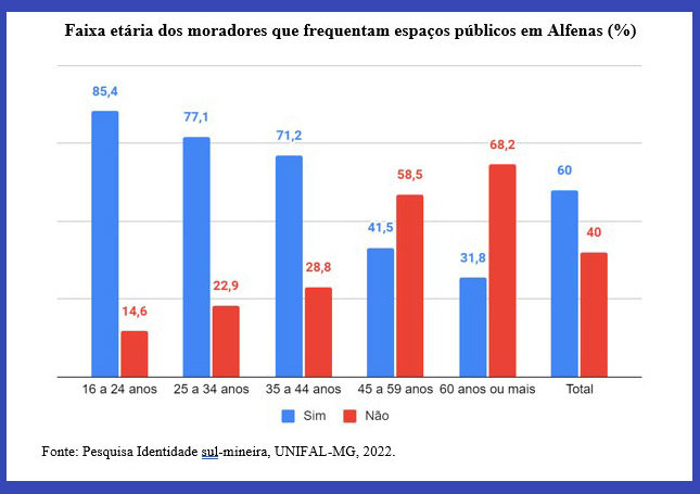 Nos outros municípios do Sul de Minas acontece o mesmo fenômeno, ou seja, os sujeitos mais jovens são os que mais costumam comparecer a espaços públicos. Com isso, é possível notar que tanto a população de Alfenas como a do Sul de Minas no geral, além de ter uma maior movimentação nos parques, praças e cachoeiras, compartilha de uma faixa etária semelhante de principais frequentadores dessas atividades.