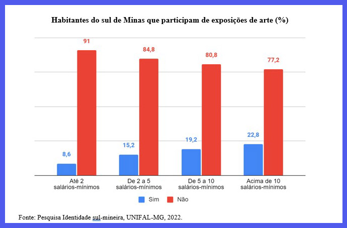 Como indica o gráfico abaixo, dentre a parte da população que frequenta exposições de arte, aqueles que possuem renda acima de 10 salários-mínimos são os que mais participam dessa atividade. Levando isso em consideração, pode-se compreender que os moradores do Sul de Minas que possuem uma renda familiar baixa apresentam um maior hábito de praticar atividades gratuitas e ir a espaços abertos. Já a parte da população sul mineira que possui uma renda maior comparece mais a atividades que possuem um custo financeiro superior, como shows musicais, peças de teatro e exposições de arte.