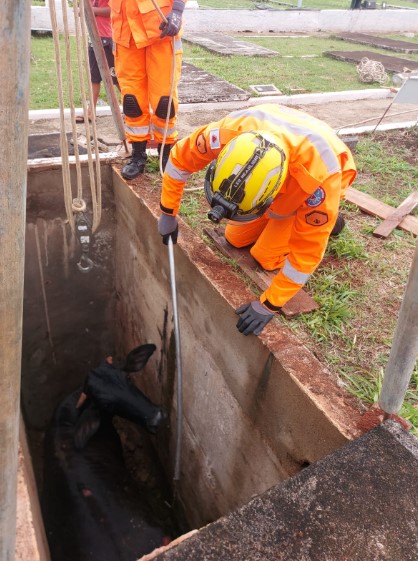 Vaca cai em túmulo e é resgatada pelo Corpo de Bombeiros