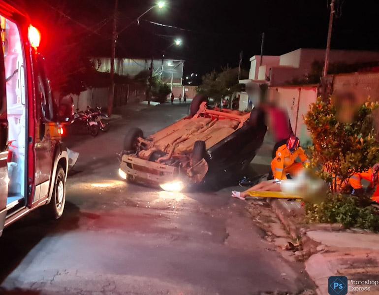Um veículo capotou, no final da noite de sábado, no bairro Morada do Sol, em Alfenas. O acidente ocorreu após o motorista bater em outro veículo, que estava estacionado.