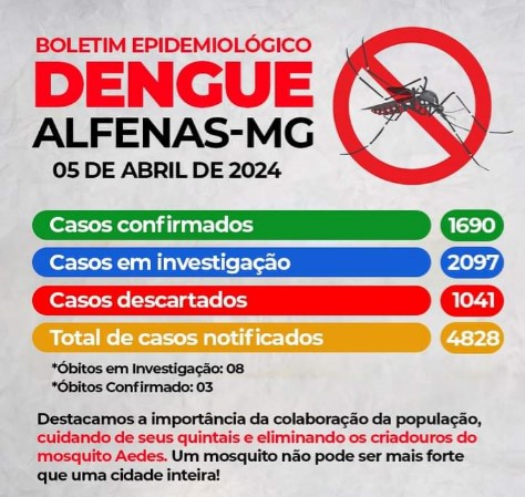 Alfenas já tem 4.828 notificações de casos suspeitos de dengue, de acordo com o boletim epidemiológico municipal. Desse total, 1.690 casos foram confirmados e outros 2.097 estão em investigação (veja na imagem abaixo). As informações foram divulgadas na última sexta-feira, dia 5.