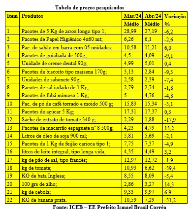 Os pesquisadores definiram 22 itens de composição da cesta básica: 02 pacotes (de 5 Kg) de arroz longo tipo 1; 02 pacotes de papel higiênico 4x60 mt; 01 pac. de sabão em barra com 05 unidades; 02 pacotes de goiabada de 300g; 01 unidade de creme dental 90g; 06 pacotes de biscoito tipo maisena 170g; 02 unidades de sabonete 90g; 01 pacotes de sal iodado de 1 kg; 02 pacotes de fubá mimoso 1 kg; 01 pac. de pó de café torrado e moído 500 g; 01 pacotes de açúcar 5 kg; 02 sachem de extrato de tomate 300 g; 02 pacotes de macarrão espaguete nº 8 500g; 02 litros de óleo de soja 900 ml; 04 pacotes de 1 kg de feijão carioca tipo 1; 03 litros de leite integral, tipo longa vida, envasado em caixa tetra pak de 01 (um) litro; 02 kg de pão de sal, tipo francês; 01 kg de tomate; 02 kg de bata inglesa; 100 grs de alho; 500 grs de cebola; 01 KG de banana prata.