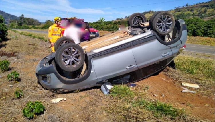 Um veículo capotou, no km 10 da Rodovia LMG-879, após a motorista perder o controle da direção. Segundo a motorista, ela desviou de um cão que estava na pista e, com isso, perdeu o controle do carro.