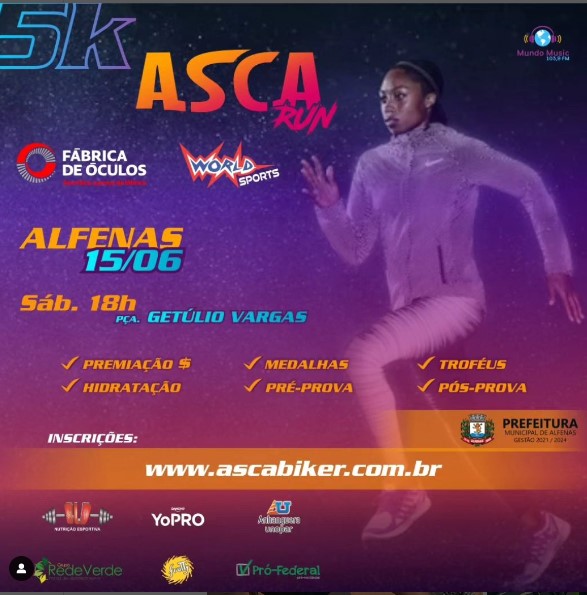 Alfenas sedia, neste final de semana, um grande espetáculo de ciclismo. Será o primeiro Asca Run, que terá início às 18h com saída da Praça Getúlio Vargas – a largada oficial está prevista para às 19h. No domingo ainda terá o Asca Biker.