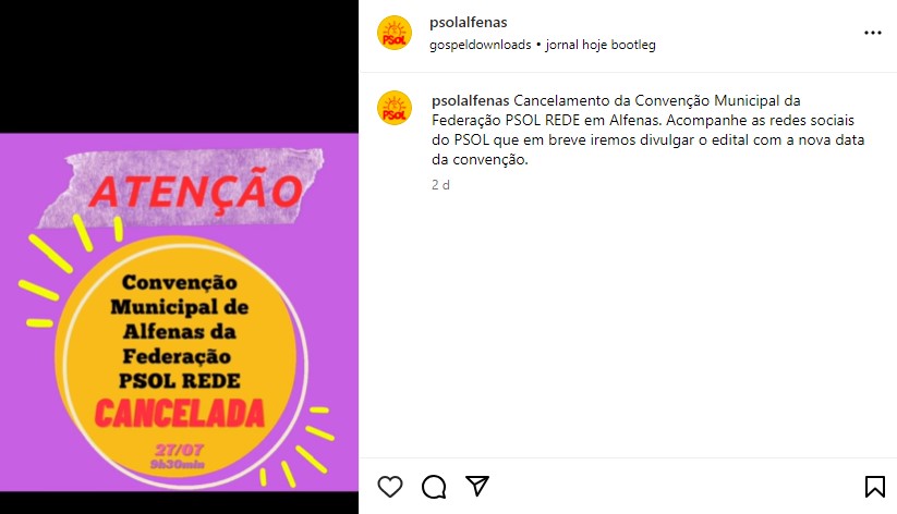 A convenção partidária da Federação Psol/Rede, que estava agendada para a manhã do último sábado, foi cancelada e está gerando um impasse interno. A Rede mantém o posicionamento inicial de lançar nome próprio para a disputa da Prefeitura de Alfenas, porém o Psol recuou e diz que ainda está avaliando essa alternativa.