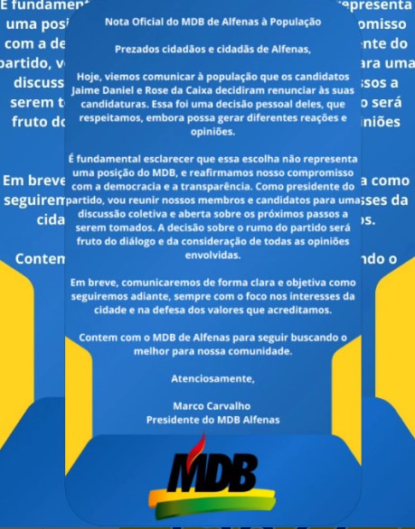A renúncia da chapa Jaime Daniel (União Brasil) e Rosilene Coutinho Modesto Junqueira (Rose da Caixa/MDB) e o apoio ao candidato Amadeu Peloso (PL) na disputa pela Prefeitura de Alfenas não representam a posição do MDB. É o que diz uma nota publicada pelo Movimento Democrático Brasileiro, partido da então candidata a vice-prefeita Rose da Caixa.
