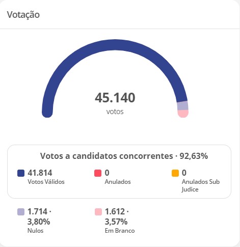Dos 45.140 eleitores que foram as urnas, foram 41.814 votos válidos para prefeito. Um total de 1.714 eleitores anularam o voto e outros 1.612 votaram em branco.