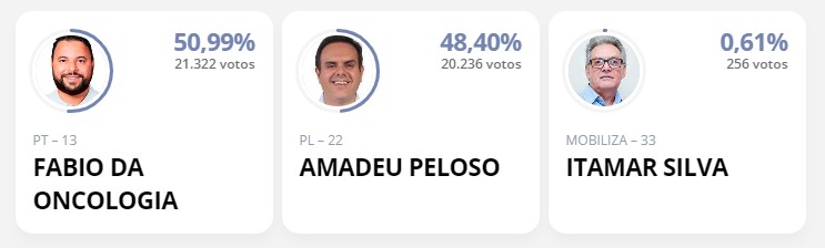 A diferença entre Fábio da Oncologia, que obteve 21.322 votos (50,99%), para o segundo colocado, Amadeu Peloso (PL), que obteve 20.236 votos (48,40%), foi de 1.086 votos. Itamar Silva (Mobiliza) teve 256 votos (0,61%).