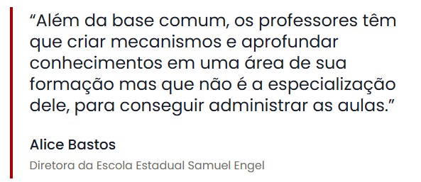 Segundo a diretora, essa realidade exige do professor se preparar num tempo muito curto para uma aplicação imediata, gerando exaustão e lacunas em alguns momentos. Para ela, falta estrutura para suporte ao novo ensino médio.