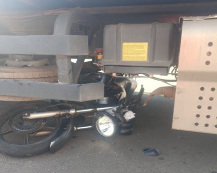 Um acidente envolvendo uma motocicleta e um caminhão ocorreu na tarde desta quarta-feira, por volta das 14h30, na Avenida Governador Valadares, em Alfenas. O impacto da colisão foi tão forte que a moto ficou presa sob o veículo de carga.