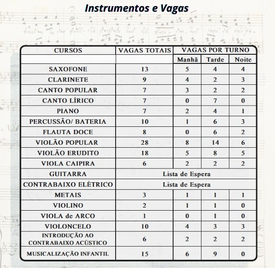 Para ingressar nos cursos de instrumento ou canto, é necessário realizar um teste de aptidão prático. Os cursos têm duração de oito semestres (quatro anos) e são divididos em três disciplinas obrigatórias: Prática de Instrumento/Canto, Canto Coral/Oficina de Cordas e Teoria Musical. O curso de Musicalização Infantil, por sua vez, tem duração de um ano e é uma disciplina única.