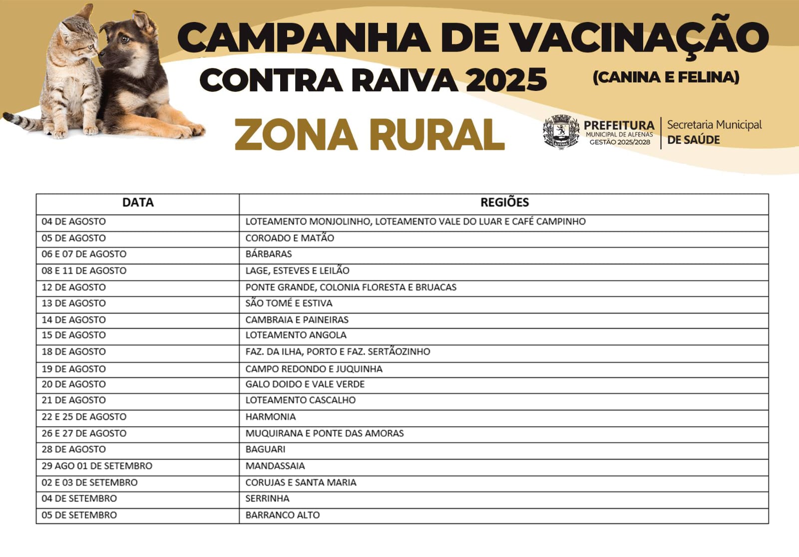 A Prefeitura de Alfenas inicia em 4 de agosto, uma segunda-feira, a campanha de vacinação antirrábica para cães e gatos. A ação tem como objetivo principal proteger os animais e, consequentemente, prevenir a transmissão da raiva para a população. A vacinação ocorrerá em vários pontos da cidade e da zona rural, nos períodos das 8h às 10h e das 14h às 16h.