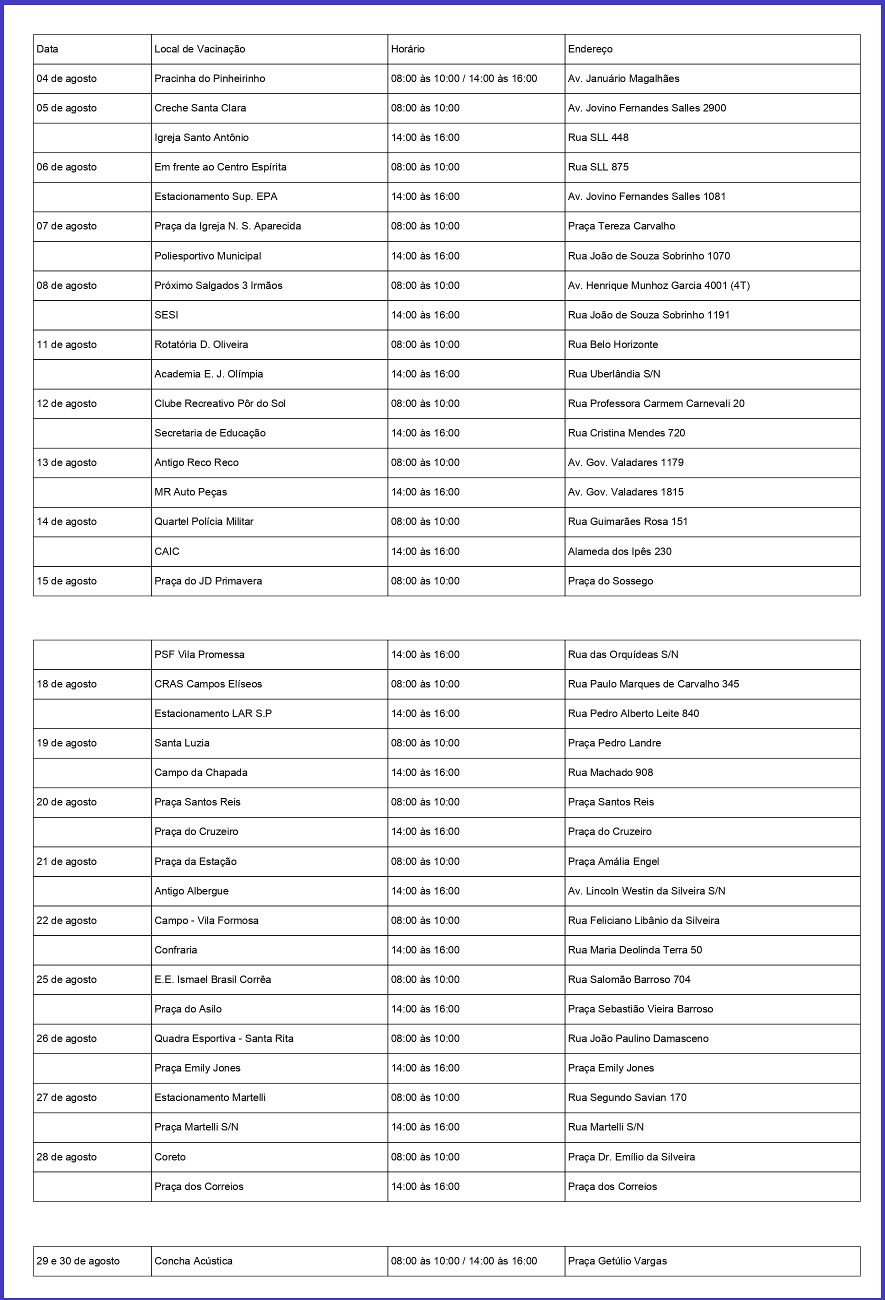 Confira a lista completa de dias, locais e horários de vacinação: