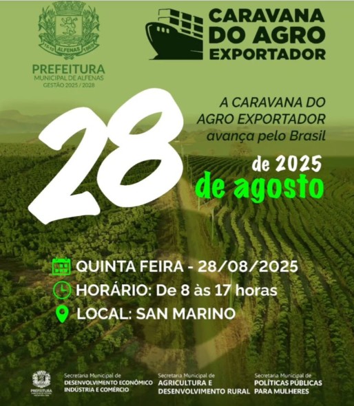 A cidade de Alfenas será a próxima parada da Caravana do Agro Exportador, um projeto itinerante do Ministério da Agricultura e Pecuária (MAPA). O evento será na próxima quinta-feira, dia 28, das 8h às 17h, no Hotel San Marino.