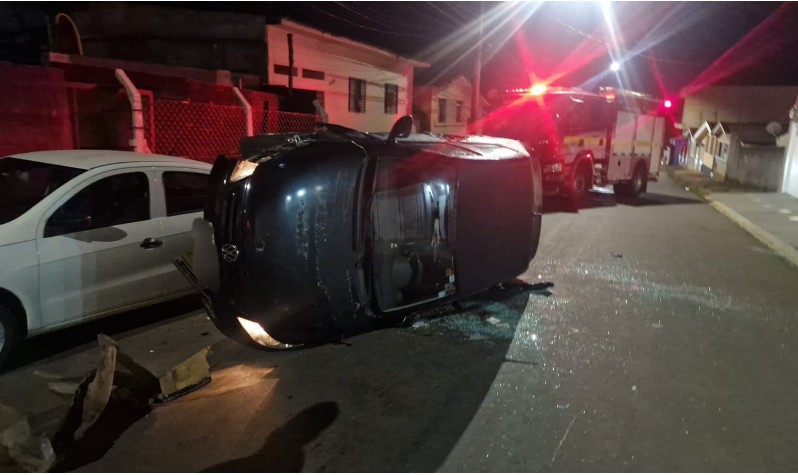 Segundo as informações, um automóvel VW Voyage atingiu um VW Gol que estava estacionado na avenida. Com a força do impacto, o Voyage acabou tombando.