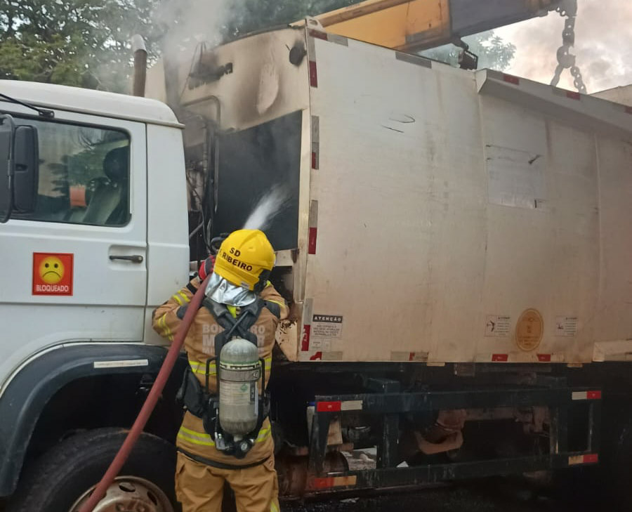 A gravidade da situação exigiu o arrombamento técnico das travas das tampas traseiras, única forma de expor o material em combustão que estava comprimido no interior do veículo.