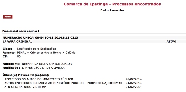 O processo chegou a Ipatinga (MG), onde Laryssa mora, nesta quarta-feira (26), conforme você vê abaixo.