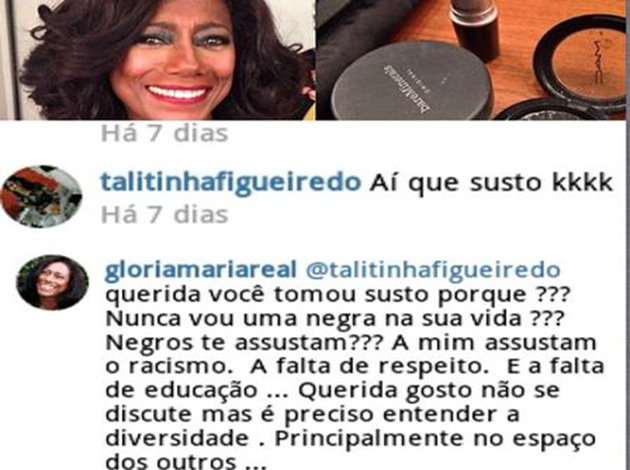 "Ai, que susto (risos)", escreveu uma internauta, deixando a famosa enfurecida. Momentos depois, a global rebateu o comentário e acusou a pessoa de racismo. "Querida, você tomou susto por quê? Nunca viu uma negra na sua vida? Negros te assustam? A mim, assustam o racismo, a falta de respeito e a falta de educação. Gosto não se discute, mas é preciso entender a diversidade. Principalmente no espaço dos outros", postou.