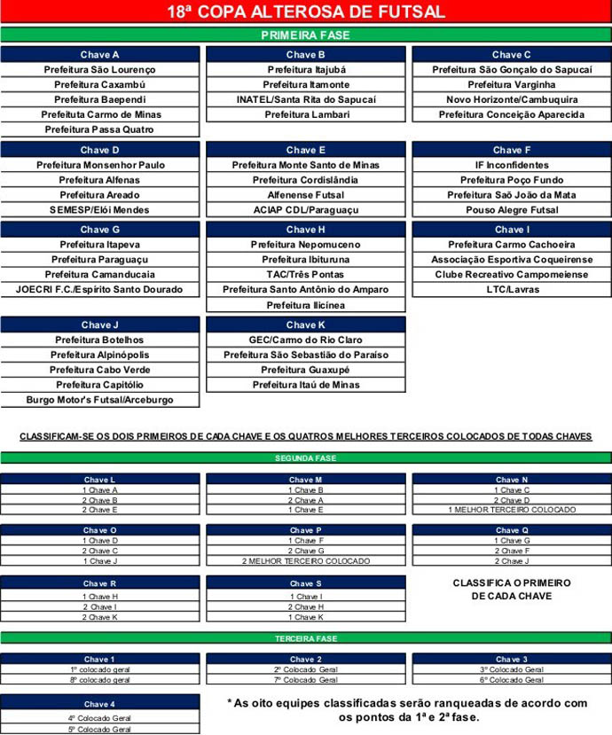 Divididas em 11 grupos, 47 disputam a 18ª edição da Copa TV Alterosa. São oito chaves com quatro equipes e três com cinco. O primeiro e o segundo de cada grupo se classificam para a fase seguinte da competição, além dos dois melhores terceiros colocados. Na segunda fase serão formados oito grupos de três equipes cada, sendo que somente o primeiro de cada chave segue na competição.