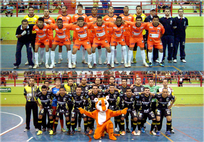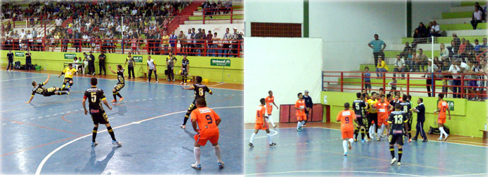 A partida começou bastante acirrada. Empurrado pela torcida que compareceu em bom número no Ginásio Poliesportivo Rosão, Pouso Alegre esboçou uma pressão sobre Alfenas, que cometeu três faltas em menos de 10 minutos. A insistência dos donos da casa acabou furando a defesa alfenense aos 13. Lucas recebeu passe de Jacarézinho e desviou a bola para o fundo do gol, sem chance para o goleiro Jonathan.